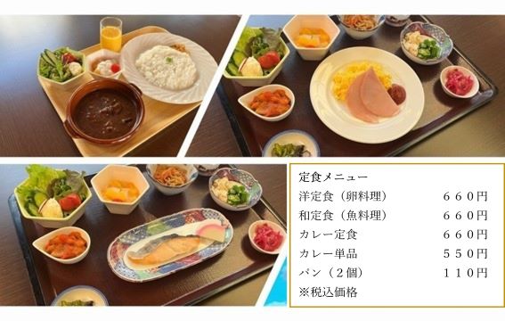 洋定食(卵料理)、和定食(魚料理)、カレー定食をお選びください。